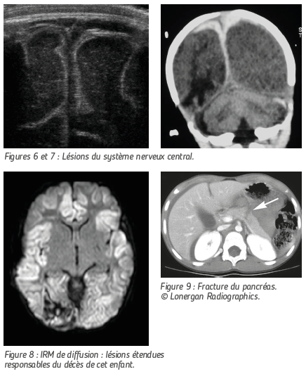 L’enfant maltraité peut être aussi victime de lésions viscérales : fracture du pancréas, du foie ou de la rate. L’échographie et le scanner permettent d’en faire le diagnostic.