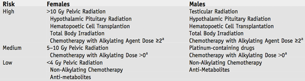 Figure 1 : Risque d’infertilité chez les patients pédiatriques et les jeunes adultes selon le traitement administré. Dillon K. E., et al., 20124.