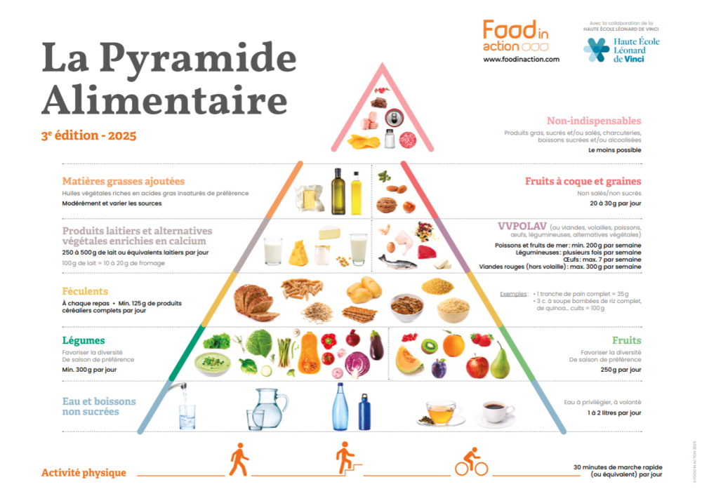 - des informations sur la pyramide alimentaire (hydratation, équilibre des apports, rôle des groupes d’aliments, activité physique)